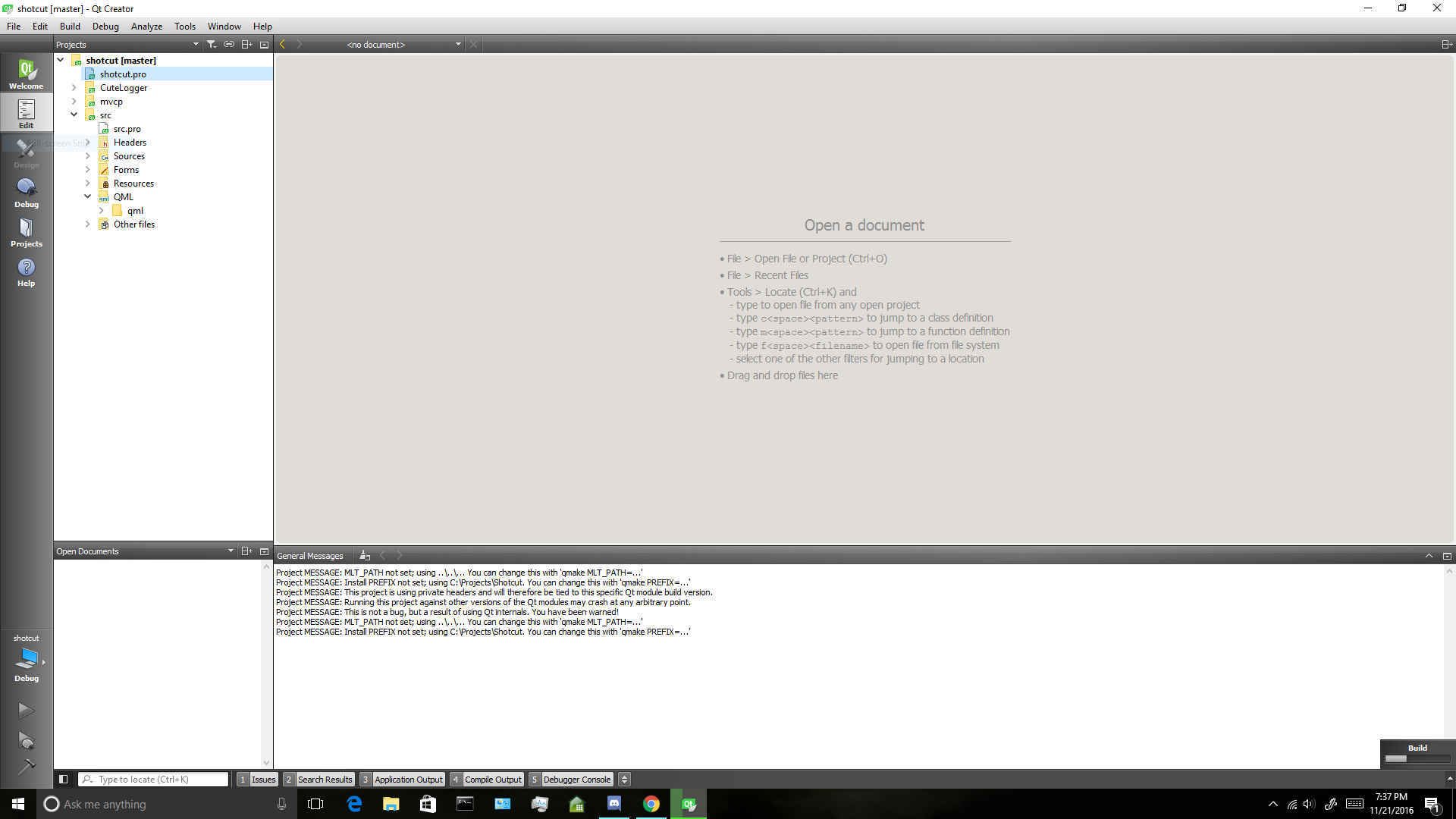 C:\Qt.tar and xz needed to extract this from msys2.)C:\ProjectsC:\ named “Projects” (C:\Projects).C:\Projects\Shotcut\src\shotcut\CMakeLists.txt.